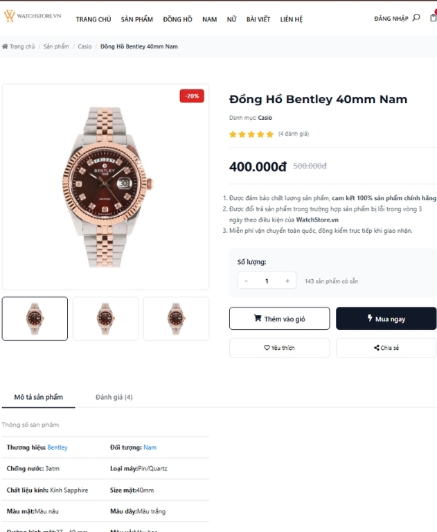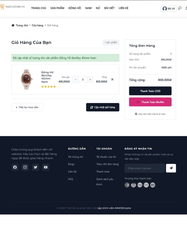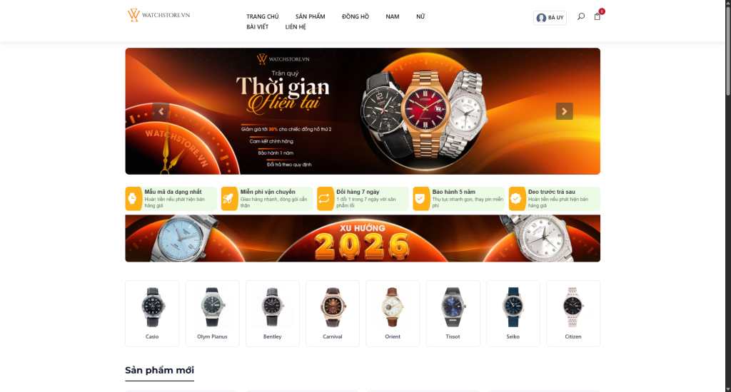 Website sở hữu giao diện trực quan, bố cục rõ ràng, tập trung làm nổi bật sản phẩm đồng hồ và phụ kiện. Trang chủ được thiết kế tối ưu cho việc trưng bày: